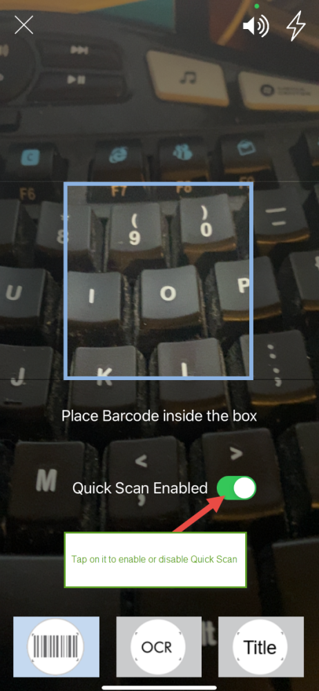To enable or disable the Quick Scan feature, tap the slider button below the viewfinder box on the camera screen.