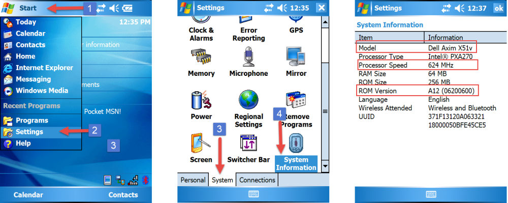 To use this method, you need to have a Dell Axim X51 or X51v PDA. Tap “Start” on the PDA, then “Settings” -> “System” -> “System Info”. You will want to get the following information: