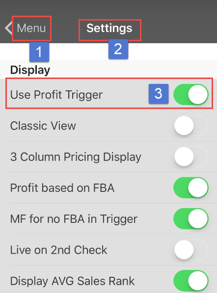 Profit triggers help sellers decide whether an item is a ‘Buy’ or a ‘Reject’ based on profit amount and other factors such as Sales Score, Ranking, FBA price, used price, new price, Amazon price, and Buy Box Price. It plays a customized sound and displays a message based on the result.