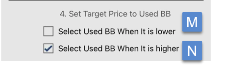 - Compare the target price against the Used Buy Box, whether the Used Buy Box price is lower (M) or higher. (N) then the current target price